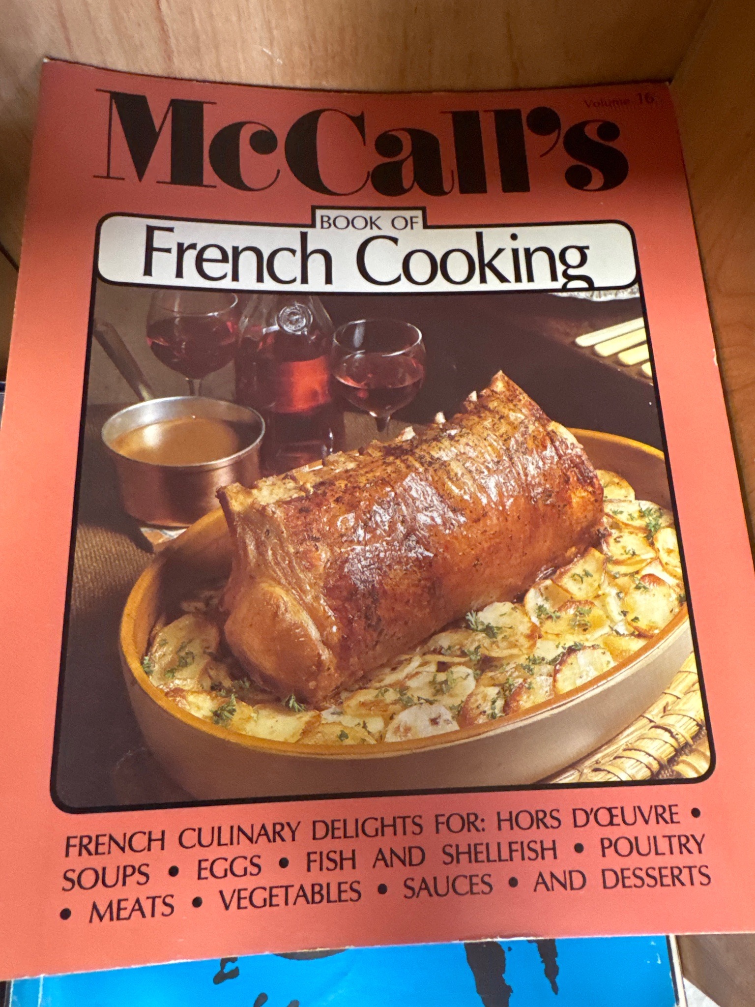 This is a vintage cookbook titled 'McCall's Book of French Cooking,' designated as Volume 16 of a larger series. The cover features a salmon-pink or deep coral background with the 'McCall's' logo in a bold, black serif font. The central image is a high-gloss color photograph of a prepared pork roast resting on a bed of sliced potatoes in a ceramic oval baker, accompanied by glasses of red wine and a copper saucepan. This item is a softcover magazine-style cookbook, typically published in the 1970s. The bottom text lists culinary categories including hors d'oeuvre, soups, eggs, fish, shellfish, poultry, meats, vegetables, sauces, and desserts. Regarding condition, there is visible shelf wear along the right and top edges, with minor creasing and some white stress marks near the spine. The corners show slight blunting, which is typical for paper-based ephemera of this age. The printing uses mid-century offset lithography, resulting in a slightly warm tone characteristic of lifestyle publications from that period. There are no obvious signatures or personal markings visible on the front cover.