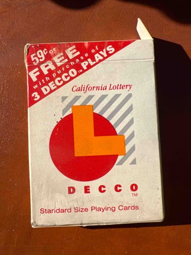 This is a vintage tuck box for a deck of playing cards produced as a promotional item for the California Lottery's 'DECCO' game. The box is made of standard cardstock and features a white background with a vibrant graphic design in red, orange, and gray. The centerpiece is the Decco logo, which consists of a red circle and a bold orange 'L' shape set against a square of diagonal gray stripes. Text on the box includes 'California Lottery', 'Standard Size Playing Cards', and a promotional banner in the upper left corner stating '59¢ or FREE with purchase of 3 DECCO™ PLAYS'. Based on the branding of the Decco game, which launched in 1990 and was discontinued in the mid-1990s, this item dates back to the early 1990s. The condition shows moderate wear characteristic of age and recreational handling. Visible issues include softening and minor crushing at the corners, edge wear along the top flap, and slight surface scuffing across the face of the white cardstock. There are faint dark specks or surface soiling visible on the central left area. The top flap is partially open, revealing a plain white interior. This piece is a unique example of 1990s lottery ephemera, representing a specific era of California state-run gaming marketing. The mass-market construction suggests it was a high-volume promotional giveaway rather than a premium collectible at the time of manufacture.