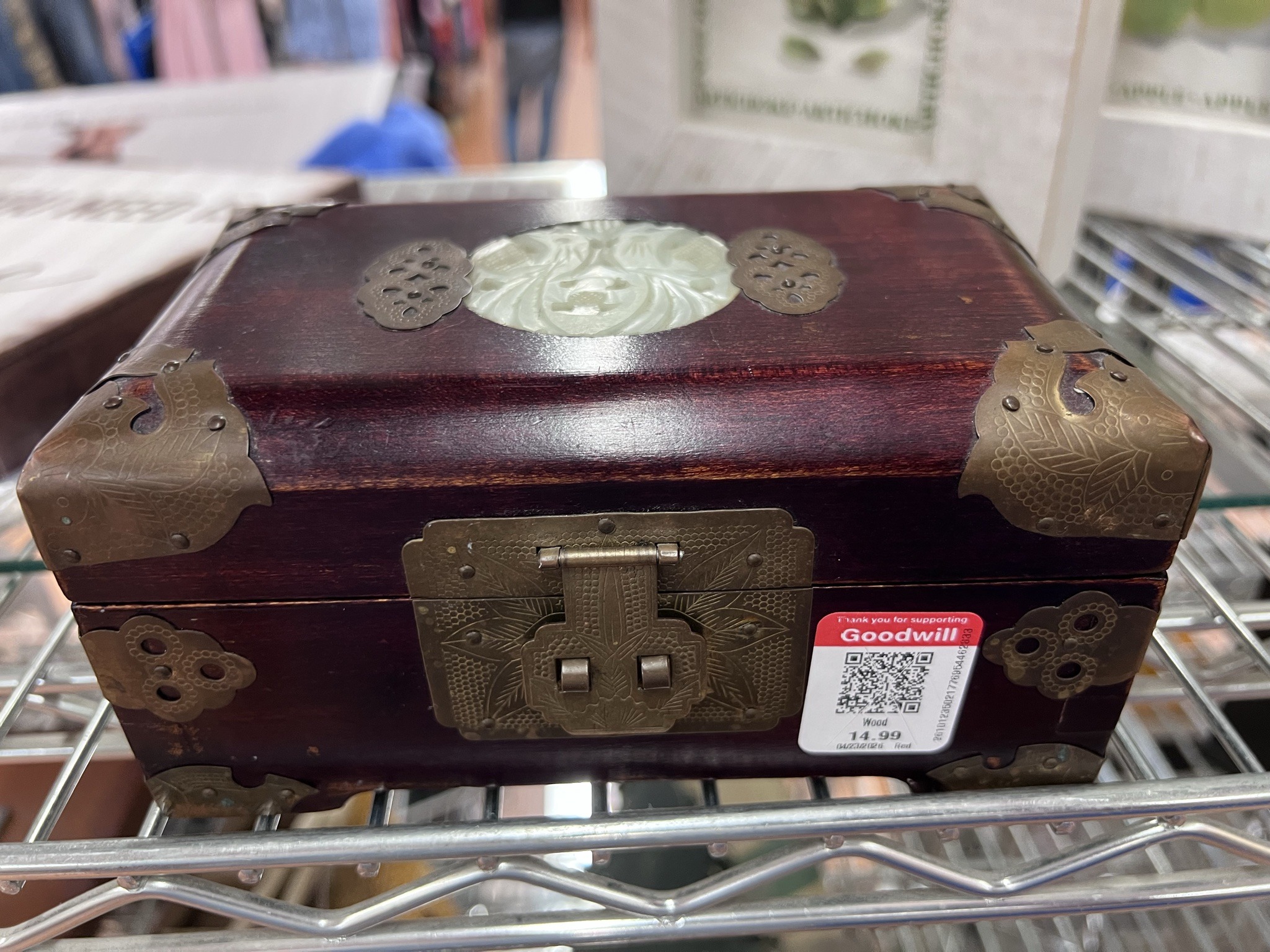 This is a rectangular wooden jewelry or trinket box, likely of Chinese origin, crafted from a dark-stained wood resembling rosewood or zitan. The central focal point is a large, oval-shaped hand-carved jadeite or nephrite medallion inlaid into the lid, featuring floral or leaf motifs in a pale celadon green hue. The box is heavily ornamented with decorative brass hardware, including intricately chased or stamped corner protectors with scalloped edges, floral-patterned side plates, and a prominent front latch assembly. The latch is a traditional paitong-style plate with a movable hasp designed for a mini padlock. The brass exhibits a natural, aged patina with greenish verdigris visible around the small upholstery-style tacks. The wood finish shows minor age-related wear, including fine hairline cracks in the grain and light surface abrasions. The craftsmanship suggests a mid-20th-century production, often exported as tourist ware or specialty gifts. The overall condition is good, considering the vintage age, though it currently bears a contemporary thrift store adhesive label on the front lower right corner which may leave residue upon removal.