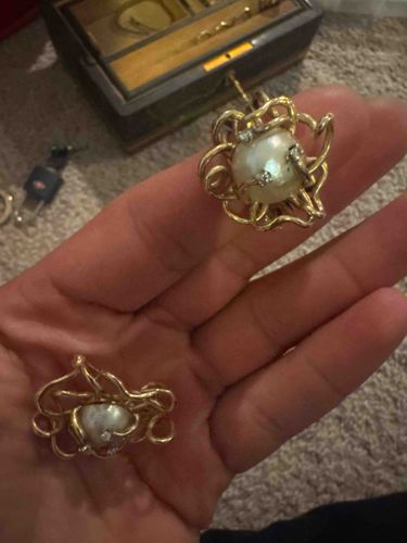 This image displays a pair of yellow gold jewelry pieces, likely earrings or a ring and earring set, featuring a mid-century modern or Brutalist aesthetic. Each piece centers a large cream-colored mabe pearl with a high luster, though visible surface irregularities and pitting suggest natural growth characteristics or minor age-related wear to the nacre. The pearls are captured within an intricate, 'bird's nest' style setting composed of thick, undulating 14k or 18k yellow gold wirework. Accenting the pearls are small, round-cut diamonds, approximately 0.01 to 0.03 carats each, grain-set into stylized white gold or platinum-topped gold prongs that wrap over the face of the pearl. The construction utilizes lost-wax casting and hand-finishing, typical of custom jeweler pieces from the 1960s to 1970s. The yellow gold exhibits a warm patina with minor surface scratches consistent with use. No visible maker's marks are discernible from the angle provided, but the organic, free-form design is characteristic of boutique high-jewelry of the late 20th century. The scale suggests these were designed as statement 'cocktail' accessories.
