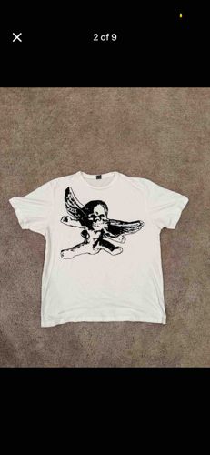 This is a short-sleeved graphic t-shirt from the luxury brand Chrome Hearts, featuring a collaboration with artist Joe Foti. The garment is constructed from a lightweight white cotton jersey material. The central focus of the piece is a large, black screen-printed graphic on the chest depicting the 'Harris Teeter' character—a macabre skeletal figure with stylized wings, which is a signature recurring motif in the Foti collection. The shirt features a ribbed crew neckline and standard double-stitched tonal hems on the sleeves and bottom. Based on the silhouette, it appears to be a contemporary production (2010s-present) and showcases the brand's heavy rock-and-roll and gothic aesthetic. The condition appears fair to good from the frontal view, though there is visible wrinkling throughout the fabric, suggesting it has been machine washed. No immediate holes or permanent stains are visible, but the white fabric and high-contrast print require close physical inspection for yellowing or cracking of the screen print to determine full market value. The shirt likely features a branded inner neck label and potentially a signature Chrome Hearts scroll logo on the back or sleeve, consistent with their usual manufacturing standards.
