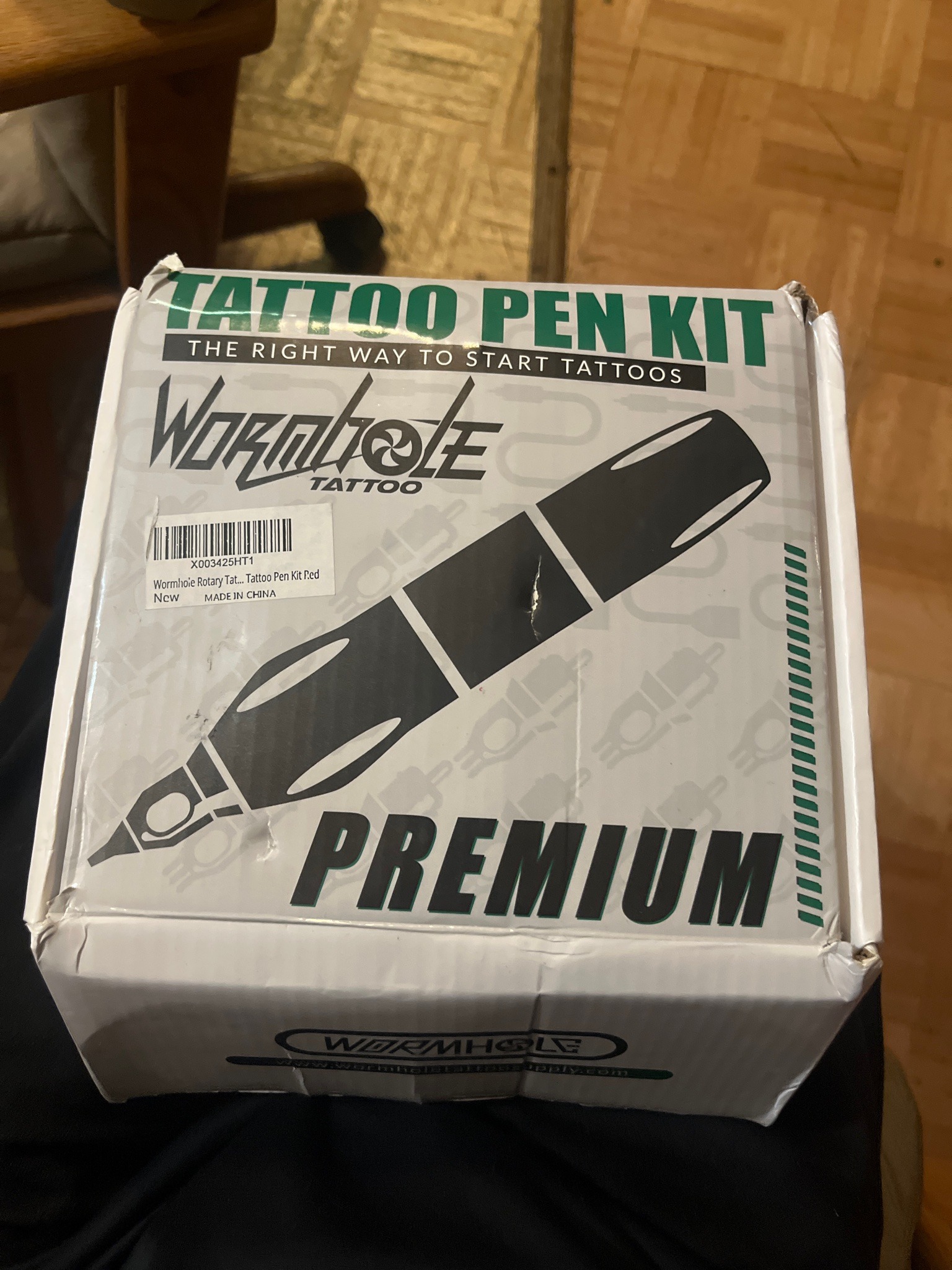 This is a contemporary 'Premium' rotary tattoo machine kit manufactured by Wormhole Tattoo. The item is housed in its original white cardboard retail packaging, which features green and black typography. According to the applied inventory sticker (X003425HT1), the internal pen-style rotary machine is red. This kit is marketed as a comprehensive starter set, likely containing the aluminum alloy rotary pen, a power supply, foot pedal, and necessary cables, as well as disposable needle cartridges. The box design includes a large graphic of the pen machine and the brand slogan 'THE RIGHT WAY TO START TATTOOS.' In terms of condition, the exterior packaging displays significant wear, including crushed corners, tears in the top surface, and creasing along the edges, suggesting moderate handling or storage stress. The sticker confirms the origin as 'Made in China.' This is an entry-level, hobbyist-grade piece of equipment typically produced in the early 2020s. While branded as 'Premium,' the mass-produced nature and cardboard housing indicate a budget-friendly consumer product rather than a high-end professional studio setup, though the rotary pen itself is designed for streamlined ergonomic use compared to traditional coil machines.