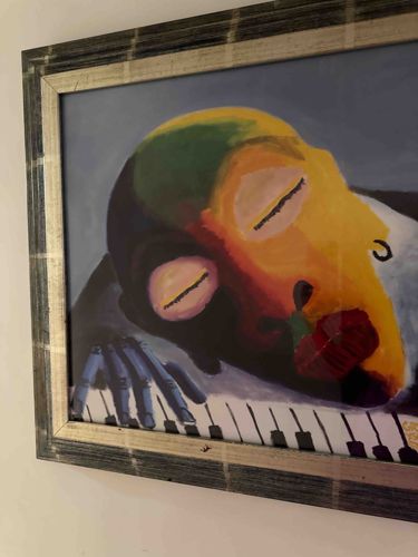 This artwork is a vibrant, modern abstract expressionist painting depicting a humanoid figure resting their head near or upon a piano keyboard. The subject features a highly stylized, multi-colored face characterized by bold patches of yellow, orange, and green, suggesting a state of deep concentration or repose with closed eyes. The figure's blue, robotic-looking fingers are positioned over stylized piano keys, blending organic and mechanical themes. The application of paint appears to be acrylic or oil, exhibiting visible brushstrokes and a layered impasto-like quality in parts of the face, indicating a contemporary or late 20th-century aesthetic. The color palette is rich and saturated, contrasted against a muted grey-blue background which enhances the foreground subject. The piece is housed in a decorative contemporary frame featuring a textured, weathered linear pattern in grey and silver tones with a metallic inner lip. The frame shows minor surface wear, including a small dark scuff or nick on the bottom-center inner edge. The composition utilizes a diagonal perspective, giving the piece a sense of movement and exhaustion. No artist signature is clearly visible in the provided view, but the boldness of the form suggests a dedicated studio work by a contemporary practitioner. The overall condition appears to be excellent with vibrant pigment retention and no visible cracking in the paint layer.