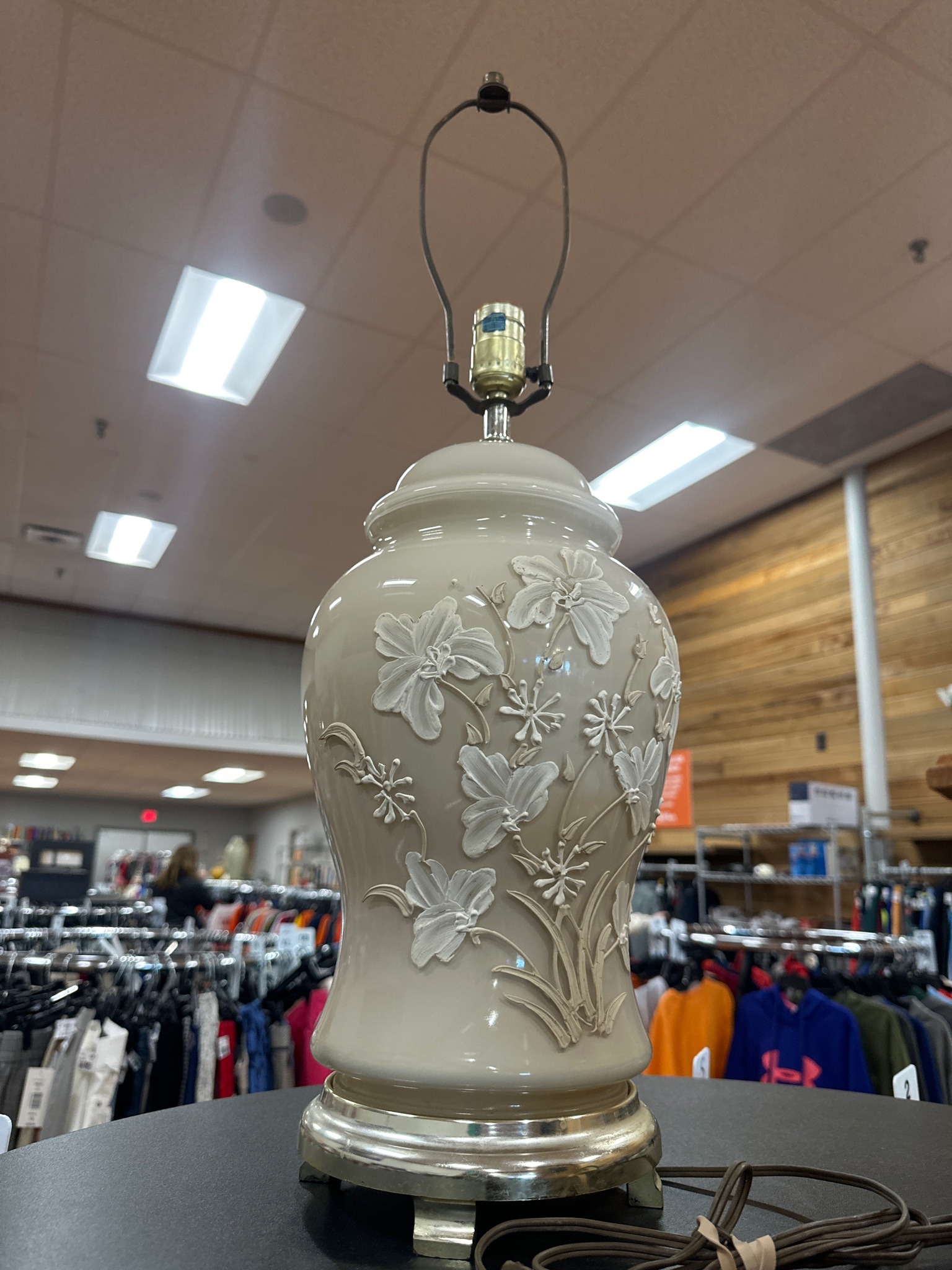 A vintage 1970s or 1980s ceramic table lamp featuring a classic baluster or ginger jar silhouette. The lamp is distinguished by a high-relief, hand-applied (impasto-style) floral motif depicting lilies or orchids in a monochromatic cream palette. The base material appears to be a fired ceramic with a high-gloss glaze in a warm off-white or light beige tone. The raised floral decorations are finished in a matte or semi-matte off-white, providing a sophisticated tactile contrast against the glossy body. The piece sits on a tiered, rounded metal base with a brushed nickel or light pewter finish, showing some minor surface scuffs and signs of age-related oxidation. The electrical components include a standard U-style harp, an antique brass-toned socket with a blue UL-listed sticker visible, and a brown plastic-coated cord. There are no immediate signs of cracks or chips in the ceramic work, though light crazing may be present upon closer inspection. The style is indicative of the 'Hollywood Regency' or 'Romantic Revival' trends of the late 20th century. The craftsmanship is of good quality, typical of mass-produced decorative boutique lighting from high-end department stores or home décor brands like Frederick Cooper or Wildwood.