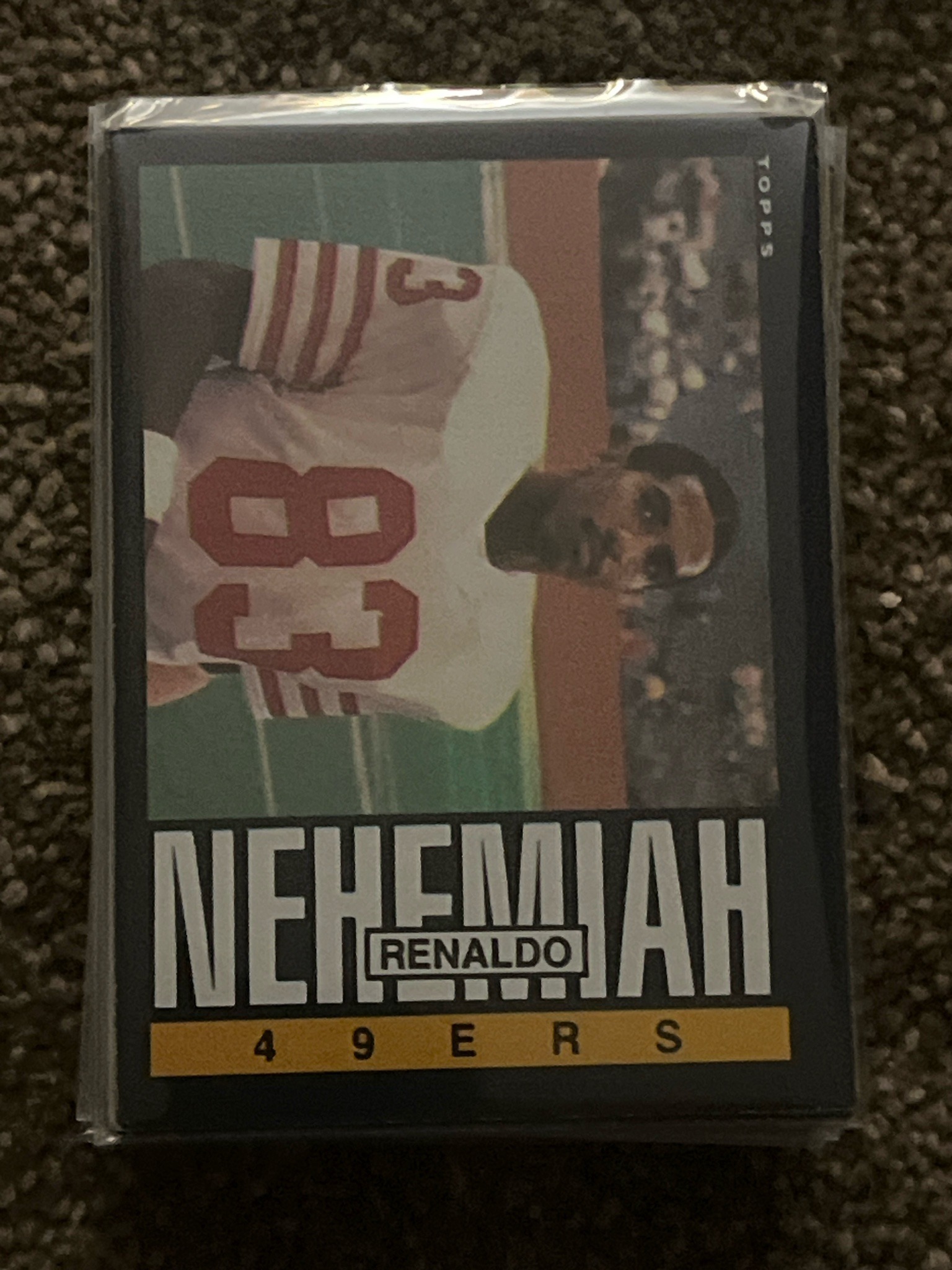 This is a vintage 1983 Topps football trading card featuring Renaldo Nehemiah of the San Francisco 49ers. The card measures the standard 2.5 by 3.5 inches and is printed on typical 1980s cardboard stock with a matte finish. The design features a large, bold vertical 'NEHEMIAH' in white block lettering at the bottom, with 'RENALDO' inset in a smaller box. Below the name is a gold-colored bar containing the team name '49ERS' in black text. The image itself depicts Nehemiah in his white and red away jersey with the number 83 prominent on the chest. The 'TOPPS' logo is vertically aligned in the upper right corner. The card is currently protected within a clear plastic penny sleeve or thin top-loader. Observed condition shows moderate centering issues, with the bottom border appearing thicker than the side borders. The corners appear relatively sharp through the plastic packaging, though some slight whitening may be present on the bottom edge. There are no visible creases or heavy surface scratches. Renaldo Nehemiah is a notable figure as he was a world-record-holding hurdler who transitioned to professional football, making this a unique 'cross-over' athlete card from the early 1980s transition era of sports collectibles.