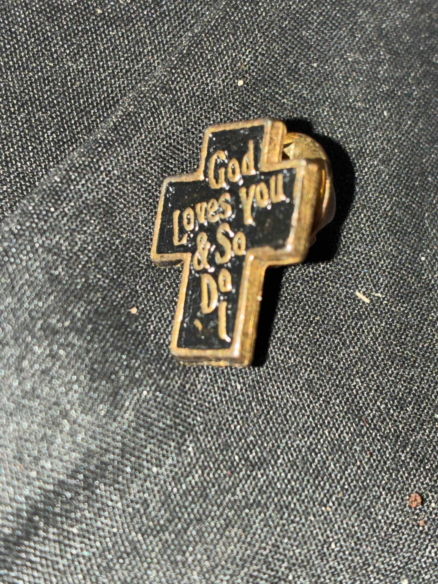 This is a small, cross-shaped lapel pin featuring a religious message. The pin is constructed from a gold-toned base metal, likely brass or a similar alloy, with a recessed black enamel inlay. The face of the cross is inscribed with the text 'God Loves You & So Do I' in a raised, gold-toned informal script. Geometrically, the cross is a flared Greek cross style with slightly wider arms than a standard Latin cross. The construction quality is typical of mass-produced mid-to-late 20th-century religious ephemera (circa 1970s–1990s). On the reverse side, a butterfly clutch or 'tack-pin' style backing is visible for securing to fabric. Regarding condition, the piece shows significant signs of wear and age. The gold plating is heavily worn along the edges, revealing a darker patina or base metal underneath. There are visible surface scratches on the black enamel, particularly on the lower vertical arm, and some minor pitting throughout the metal borders. No discernible maker's marks or hallmarks are visible in the photograph, indicating it was likely a gift shop or church-distributed token. Despite the wear, the text remains legible, and it serves as a characteristic example of sentimental Christian jewelry from its era.