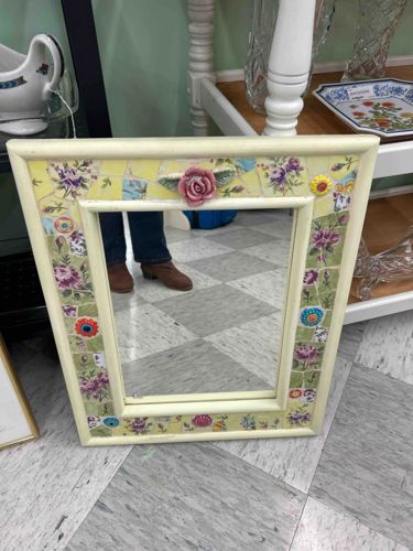 This is a rectangular wall mirror featuring a decorative pique-assiette mosaic frame. The construction consists of a wood frame painted in a cream or off-white finish, which serves as a border for a recessed channel filled with broken ceramic shards. The mosaic pieces include various floral-patterned china fragments in shades of purple, blue, and green, set against a predominantly yellow cracked tile background. A prominent three-dimensional ceramic pink rose with green leaves is centered at the top of the frame, acting as a focal point. Additional colorful ceramic florets in yellow, blue, and orange are scattered throughout the mosaic work. The craftsmanship is indicative of a folk-art or handmade cottage-style piece, likely dating from the late 20th century. The mirror glass appears intact, though the frame shows some minor wear consistent with age, including faint scuffs on the painted wood borders and dust accumulation within the grout lines. There are no signs of significant structural damage or missing tile pieces. The style is quintessentially 'Shabby Chic' or Victorian revival, emphasizing reclaimed materials and romantic floral motifs.