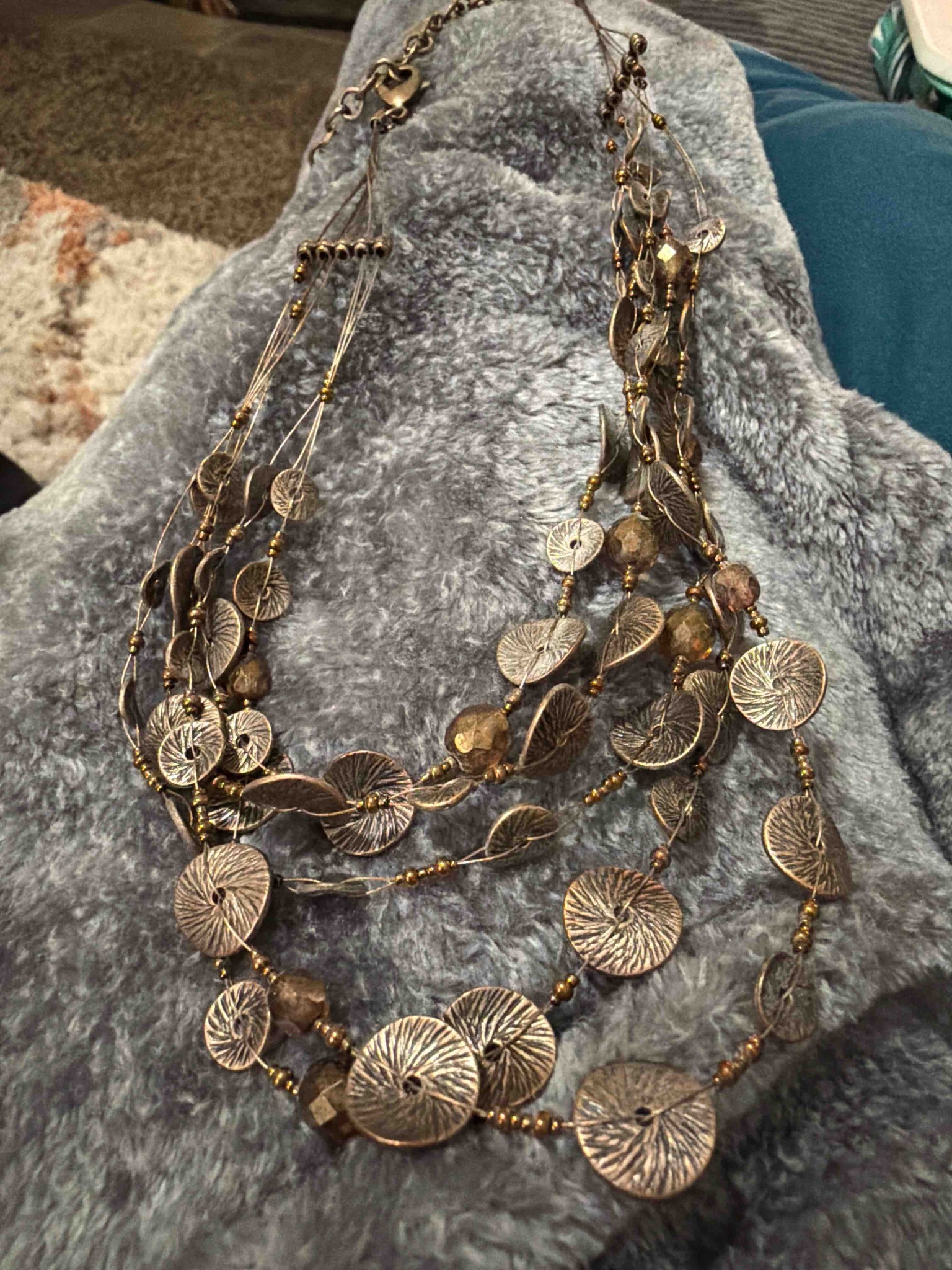 Multi-Strand Textured Metal Coin and Faceted Bead Statement Necklace