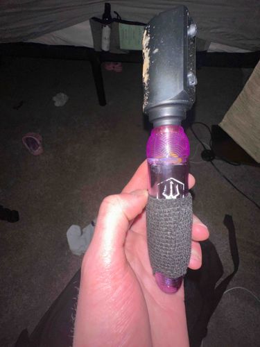 This is a modern rotary-style tattoo pen machine, identified by the distinctive trident-shaped logo on the central barrel, characteristic of the Triton brand. The device features a cylindrical pen-style chassis constructed from clear and translucent purple polycarbonate or acrylic materials, allowing internal mechanisms to be partially visible. It is equipped with a black, top-mounted wireless battery pack, which is connected via a standard interface, likely RCA. The grip section of the pen is currently wrapped in black cohesive self-adherent bandage (grip tape) for ergonomic comfort and hygiene during operation. Directly above the grip tape, the clear housing displays a white trident graphic, and above that, a translucent purple section showcases an engraved or printed geometric wave pattern. Regarding condition, the wireless battery pack at the top shows significant wear, with noticeable white scuffing or material degradation on the side, suggesting heavy use or impact. The bottom purple tip where the needle cartridge would be inserted appears intact. This style of machine is typical of contemporary professional tattoo equipment (post-2015), designed for portability and freedom from power cords through the use of high-capacity lithium-ion battery attachments.
