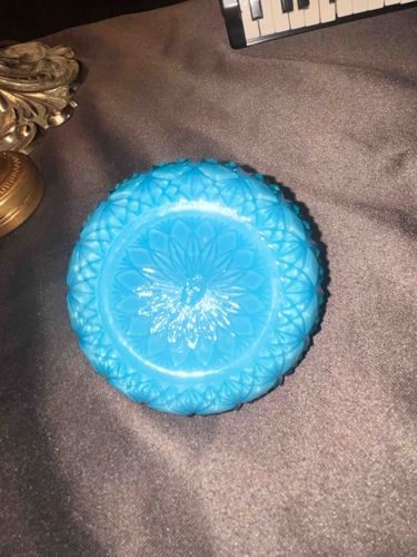 This item is a circular base for a pressed glass lidded dish, specifically matching the well-known 'Hen on Nest' pattern. It is crafted from opaque turquoise or 'robin's egg' blue milk glass. The design features a complex pressed geometry, with a central sunburst or stylized floral medallion on the bottom interior, surrounded by an intricate ruffled or pointed 'sawtooth' rim border. The exterior walls appear to have a basketweave or cross-hatched texture characteristic of mid-century American glass manufacturers. Based on the vibrant turquoise hue and the specific pattern of the pressed glass, it is likely manufactured by the Westmoreland Glass Company or potentially Boyd's Crystal Art Glass, dating to the mid-20th century (circa 1950s-1970s). The condition appears good with no significant cracks or large chips visible from this angle, though the sawtooth edges on these pieces are highly prone to 'flea bite' nicks. The piece displays a matte to semi-satin finish typical of high-quality vintage milk glass. There are no clearly visible maker's marks in the image, common for Westmoreland pieces which often used paper labels.