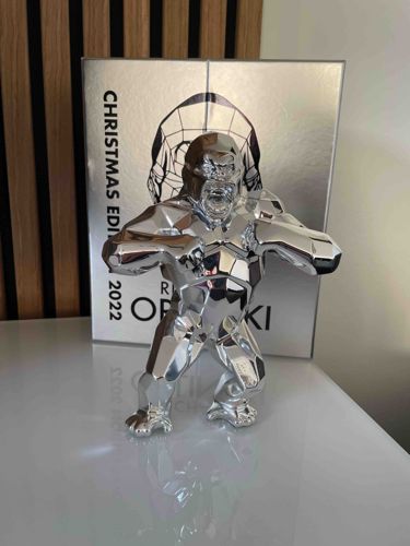 This item is a limited edition 'Kong' sculpture by contemporary French artist Richard Orlinski, specifically the 2022 Christmas Edition. The sculpture depicts a roaring gorilla, standing in an aggressive, chest-thumping pose. Physically, it is characterized by Orlinski's signature 'Born Wild' aesthetic, featuring sharp, faceted, and diamond-cut edges that create a geometric interpretation of the animal form. The piece is finished in a high-gloss, mirror-polished silver chrome coating over a resin core. It stands approximately 13 centimeters tall and exhibits a flawless, reflective surface which is a hallmark of the artist's POP art style. Included is the original silver-colored presentation box with vertical black lettering on the left side stating 'CHRISTMAS EDITION 2022' and 'RICHARD ORLINSKI' centered below a line-art graphic of the Kong head. The condition appears to be excellent with no visible scuffs, oxidation to the chrome, or retail damage to the box. The craftsmanship is high-quality, showcasing precise angular construction and a uniform finish that reflects the contemporary fusion of street art and luxury sculpture. As a seasonal release from 2022, it represents a specific collectible window for Orlinski enthusiasts.