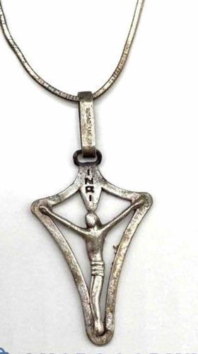 This is a vintage James Avery sterling silver crucifix necklace, demonstrating the brand's signature modernist approach to Christian iconography. The pendant features a stylized, fluid depiction of the figure of Christ with arms outstretched within an open-work, curved triangular frame. Above the figure's head is a distinct vertical plaque inscribed with the letters 'INRI' in a vertically oriented serif font. The piece is crafted from sterling silver (.925) and shows a significant amount of natural oxidation and dark patina, particularly in the recessed areas around the figure and within the lettering, which provides a high-contrast depth to the design. The pendant is suspended by a simple attached bail, which also displays impressed hallmarks and silver content stamps. It is paired with a matching sterling silver snake chain. Condition-wise, the item shows signs of regular wear including surface micro-scratches and heavy tarnish throughout, but it maintains its structural integrity without significant deformation or repairs. The craftsmanship is typical of the mid-to-late 20th-century James Avery style, characterized by solid weight and clean, bold lines that prioritize symbolic representation over ornate detail.