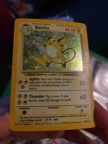 This is a vintage Pokemon trading card featuring the character Raichu, identified as card 14/102 from the original 1999 Base Set published by Wizards of the Coast. The item is a standard-sized card printed on thin cardstock with a distinctive yellow border and a central holographic 'starfoil' window depicting the character. Construction utilizes offset lithography for text and background, with a metallic foil layer integrated for the artwork. Notable features include the Stage 1 evolution status, 80 HP, and two moves: 'Agility' and 'Thunder'. The bottom copyright line displays the 1995, 96, 98 Nintendo/Creatures/GAMEFREAK and 1999 Wizards credits, with artwork by Ken Sugimori. Regarding the condition, the card shows significant signs of play and aging. There is visible whitening along the right edge and corners, surface scratches on the holographic window (particularly near the bottom of the art box), and a noticeable vertical crease or indentation running down the center-right side. The centering appears slightly heavy toward the bottom-left margin. This card represents a key piece of late-1990s pop culture and remains a highly sought-after collectible despite the moderate-to-heavy wear present on this specific specimen.
