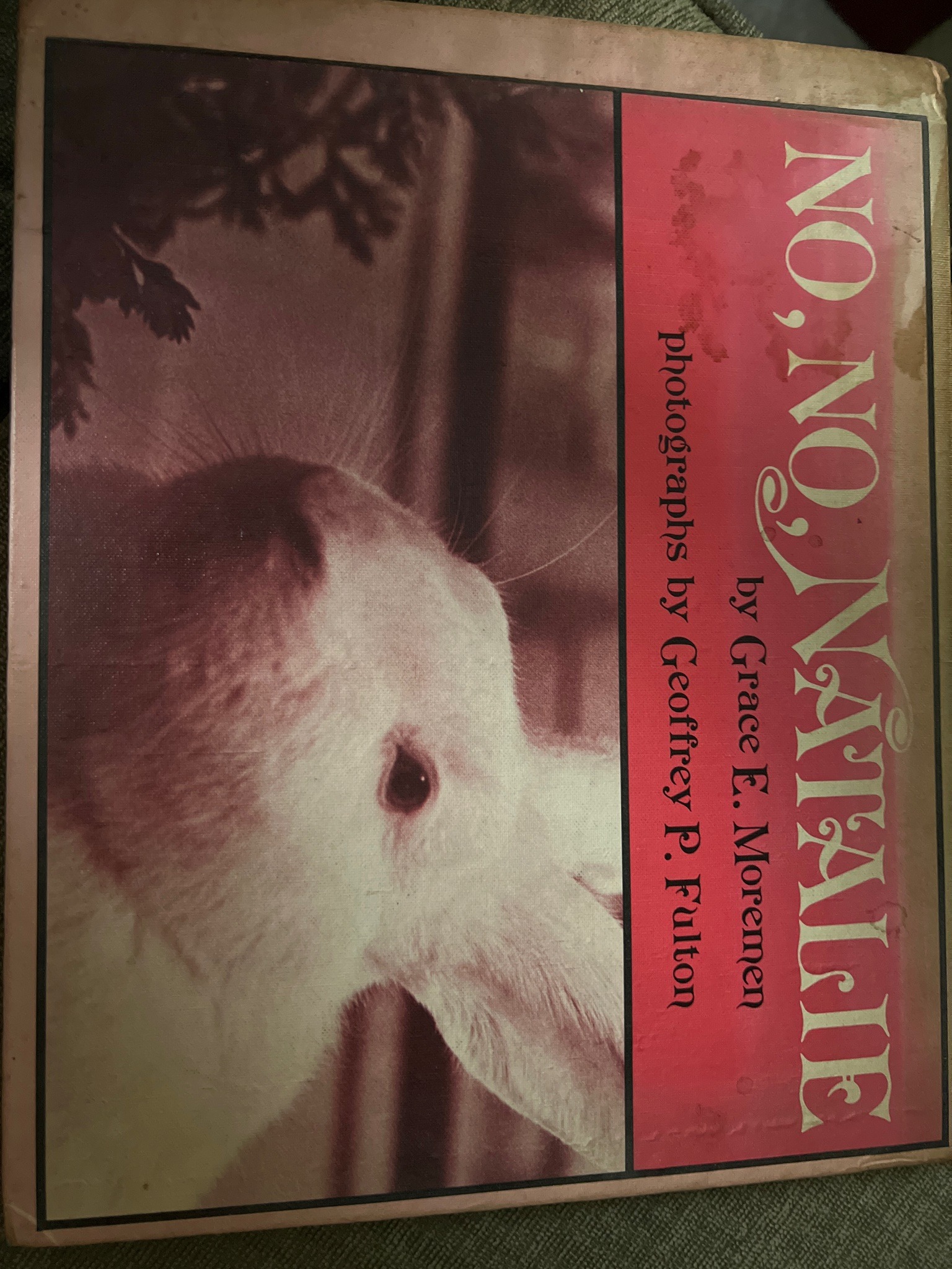 This is a vintage hardcover children's book titled 'No, No, Natalie,' written by Grace E. Moremen with photography by Geoffrey P. Fulton. Published in 1973 by Childrens Press, this work fits the style of 1970s educational or narrative photography books for young readers. The cover features a distinctive design with a sepia-toned, high-contrast close-up photograph of a white rabbit (presumably Natalie) taking up the left two-thirds of the frame. The right third is dedicated to a vibrant pink/magenta vertical stripe containing the title in stylized, white serif typography and author credits in black. Physically, the book appears to be a library-bound or sturdy hardcover edition with a textured surface, possibly buckram or reinforced paper over board. Regarding condition, there is several notable issues: visible shelf wear and bumping at the corners, significant discoloration/browning at the upper right and left edges indicating age-related oxidation or tanning, and distinct water staining or foxing spots on the pink title area. There are also vertical scratches or scuffs running through the pink section near the bottom. The binding appears intact but shows softening at the spine ends. This book is a representative example of late 20th-century children's literature that utilized real-life photography rather than illustrations to convey a story.