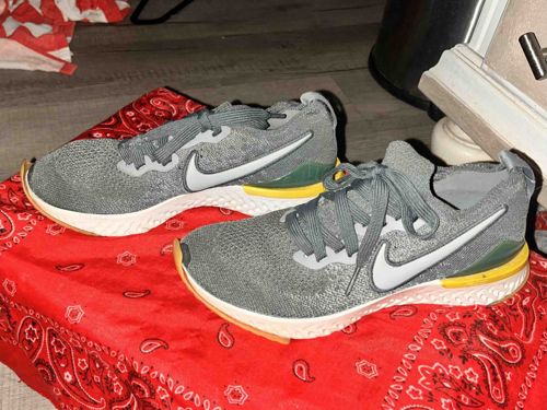 This is a pair of Nike Epic React Flyknit running shoes, characterized by a grey woven Flyknit upper that provides a flexible, lightweight, and breathable fit. The sneakers feature a prominent white Nike Swoosh on the lateral sides and a white textured foam midsole, which utilizes Nike's React technology for energy return and cushioning. Distinguishing color accents include a vibrant yellow heel clip and a forest green overlay on the rear heel area. The outsole is finished with a gum-colored rubber at the toe and heel for enhanced traction. The shoes are equipped with matching grey flat laces and integrated pull tabs at the heel for easy entry. In terms of condition, the shoes show signs of moderate wear; the white midsoles exhibit some light surface soiling and compression creases typical of use, though the Flyknit uppers appear structurally sound without visible tears. These shoes represent a modern performance athletic style, likely manufactured between 2018 and 2020. The craftsmanship is high-quality, featuring seamless knit construction and heat-welded reinforcements around the eyelets.