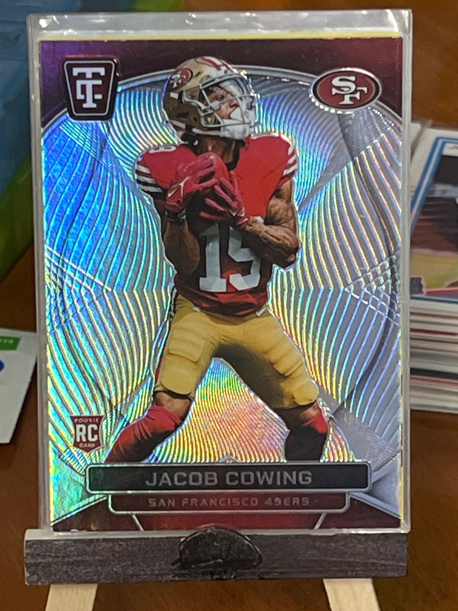 This is a modern sports trading card featuring Jacob Cowing of the San Francisco 49ers. The card is a standard 2.5 by 3.5-inch size, constructed from high-quality cardstock with a distinctive holographic or 'Prizm' style finish that reflects a full rainbow spectrum of light across a textured, wavy background pattern. The player is depicted in a full-action pose wearing a red 49ers jersey with number 19 and gold pants. Notable markings include the 'Tiffany' brand logo in the upper left, the official 'SF' 49ers logo in the upper right, and a 'Rookie Card RC' shield logo in the lower left. The bottom center features the player's name and team in a black and red footer bar. The card appears to be in near-mint to mint condition, protected by a plastic top-loader and sleeve, though micro-scratches on the plastic holder are visible. The centering looks slightly heavy toward the left side, but the corners and edges appear sharp from this perspective. This card represents a key modern collectible from the 2024 NFL season, showcasing high-tier manufacturing quality and vibrant light-diffraction techniques characteristic of premium Panini-era products.