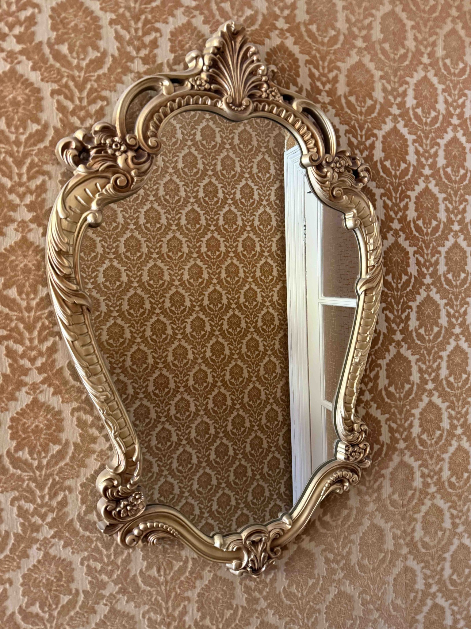This is a medium-sized wall mirror featuring an asymmetrical, cartouche-shaped frame inspired by the Louis XV Rococo period. The frame is finished in a uniform champagne-gold or 'antique gold' gilding, likely a modern metallic finish over a composite or wood base. Construction details suggest a Victorian Revival or late-20th-century decorative piece rather than an 18th-century antique. The frame is heavily embellished with signature Rococo motifs, including a prominent pierced shell (coquille) crest at the top, flowing C-scrolls, acanthus leaf flourishes along the sides, and floral clusters at the shoulders and bottom corners. The inner edge of the frame features delicate gadrooning or beadwork bordering the glass. The mirror glass itself appears clear and is set without a bevel, which is common in more modern reproductions. Physically, the item appears to be in excellent condition with no visible chips to the ornate carvings or cracks in the glass. The gilding is bright and consistent with minimal patina or oxidation, maintaining a soft sheen. While it lacks the authentic hand-carved grain and heavy gesso cracking of a true period piece, the craftsmanship is high-quality for a decorative home furnishing, providing a sophisticated vintage aesthetic. The item is set against damask wallpaper, accentuating its formal, classical design.
