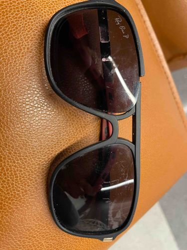 This is a pair of Ray-Ban sunglasses featuring a modern, active-style frame. The frames are constructed from a matte black, rubberized or nylon-based synthetic material, providing a lightweight and durable build characteristic of contemporary sport-lifestyle eyewear. The lenses are dark brown or charcoal tinted and feature the white 'Ray-Ban P' signature logo in the upper corner of the right lens, indicating they are equipped with polarized technology to reduce glare. The frame design utilizes a bridge and brow-bar double-bridge construction, which is a hallmark of navigator or aviator influence. The interior of the temples shows a distinctive red lining, adding a sporty aesthetic contrast to the exterior black. Regarding condition, the lenses show significant visible surface scratches and 'crazing' or peeling of the lens coating, which heavily impacts visual clarity and secondary market value. The matte finish of the frames appears to have accumulated dust and superficial wear marks. These appear to be a 21st-century production model, likely from the 'Active Lifestyle' collection, though the specific model number inside the temples is obscured in this view. Quality indicators include the consistent logo application and the integrated hinge design common to high-volume luxury house production.