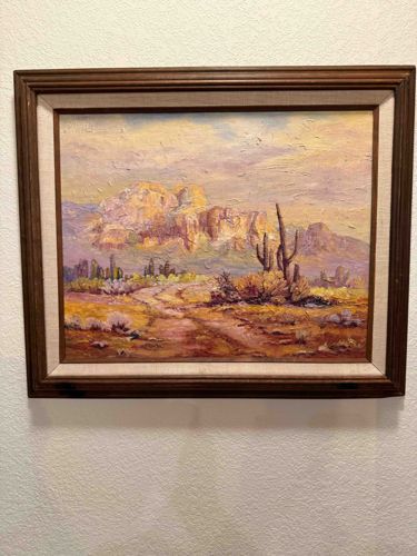 This item is an original oil painting on canvas measuring 24x24 inches, depicting a vibrant Southwestern desert landscape. The composition features a sun-drenched mountain range, likely inspired by regions like Sedona or the Superstition Mountains, under a pale lavender and yellow sky. The foreground includes a dirt path winding through desert scrub and various Saguaro cacti. This piece is executed in a heavy impasto technique, where thick layers of paint are applied to the canvas to create a tactile, three-dimensional texture. The color palette is dominated by warm ochres, siennas, and oranges, contrasted with cool purples and greens in the shadows and vegetation. This style is characteristic of late 20th-century American Southwestern regionalism, likely dating from the 1970s to the 1980s. The artwork is housed in a contemporary mid-century style wooden frame with a beige linen liner and a thin gold-toned inner fillet. The frame shows minor signs of wear including small surface scuffs and minor separation at the mitered corners. While a signature is not immediately visible in the provided image, the craftsmanship suggests a skilled hand with a strong command of light and atmospheric perspective. The impasto application is particularly well-handled, providing a lively sense of movement throughout the sky and rugged terrain.