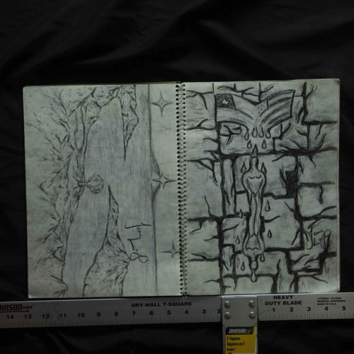 This item is an original spiral-bound sketchbook featuring expressive figurative and symbolic drawings by Jean Larry. The medium appears to be a combination of charcoal, graphite, and possibly ink on white or off-white paper. The left-hand page displays an abstract landscape or cavernous scene with organic, jagged vertical forms and celestial-like four-pointed stars, signed 'Jean L.' in the lower-right quadrant. The right-hand page features a more structured composition depicting a stone wall or grid pattern with a centrally placed stylized figure and a banner or flag at the top that seems to be dripping; this page is also signed 'Jean Larry' in the lower-right corner. Physically, the book is a standard top-wire spiral-bound sketchbook, shown flat to reveal two facing pages. The size is approximately 11 to 12 inches wide when open, based on the dry-wall T-square ruler visible at the bottom of the frame. The condition appears to be fair to good, with some evidence of handling wear, minor smudging characteristic of charcoal medium, and slight yellowing of the paper edges typical of mid-to-late 20th-century paper stock. The drawings demonstrate a unique, raw stylistic approach with heavy emphasis on line and contrast, suggesting a contemporary or folk-art aesthetic. No significant tears or major structural damage are visible in the photograph, though page edges show minor ruffling.