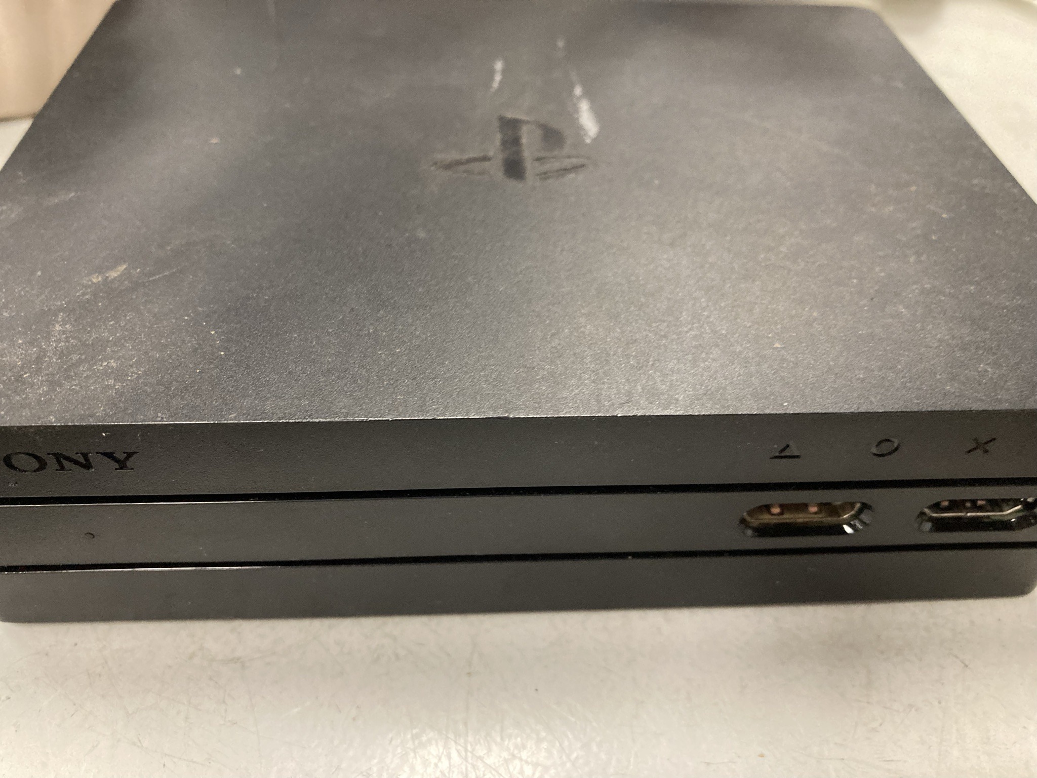 This is a Sony PlayStation 4 Pro gaming console, identified by its unique three-tier 'sandwich' design and matte black plastic housing. The unit features a debossed PlayStation 'PS' family logo on the top surface and a 'SONY' logo on the front-left edge. To the right, iconic PlayStation button symbols (Triangle, Circle, Cross) are visible above two USB ports. The console is constructed from durable injection-molded polymers with a textured finish designed to minimize fingerprints, though the top shell shows significant surface marks, scuffs, and a dusty patina. There are notable white vertical streaks or scratches near the top logo and general grime accumulation along the front horizontal crevices. Released in 2016, this Pro model was the high-end iteration of the eighth-generation console, supporting 4K resolution and high-frame-rate gaming. While functionally robust, this specific unit shows signs of heavy use and poor storage conditions, lacking the original pristine luster. The ports appear clear but could benefit from professional cleaning to ensure reliable connectivity.