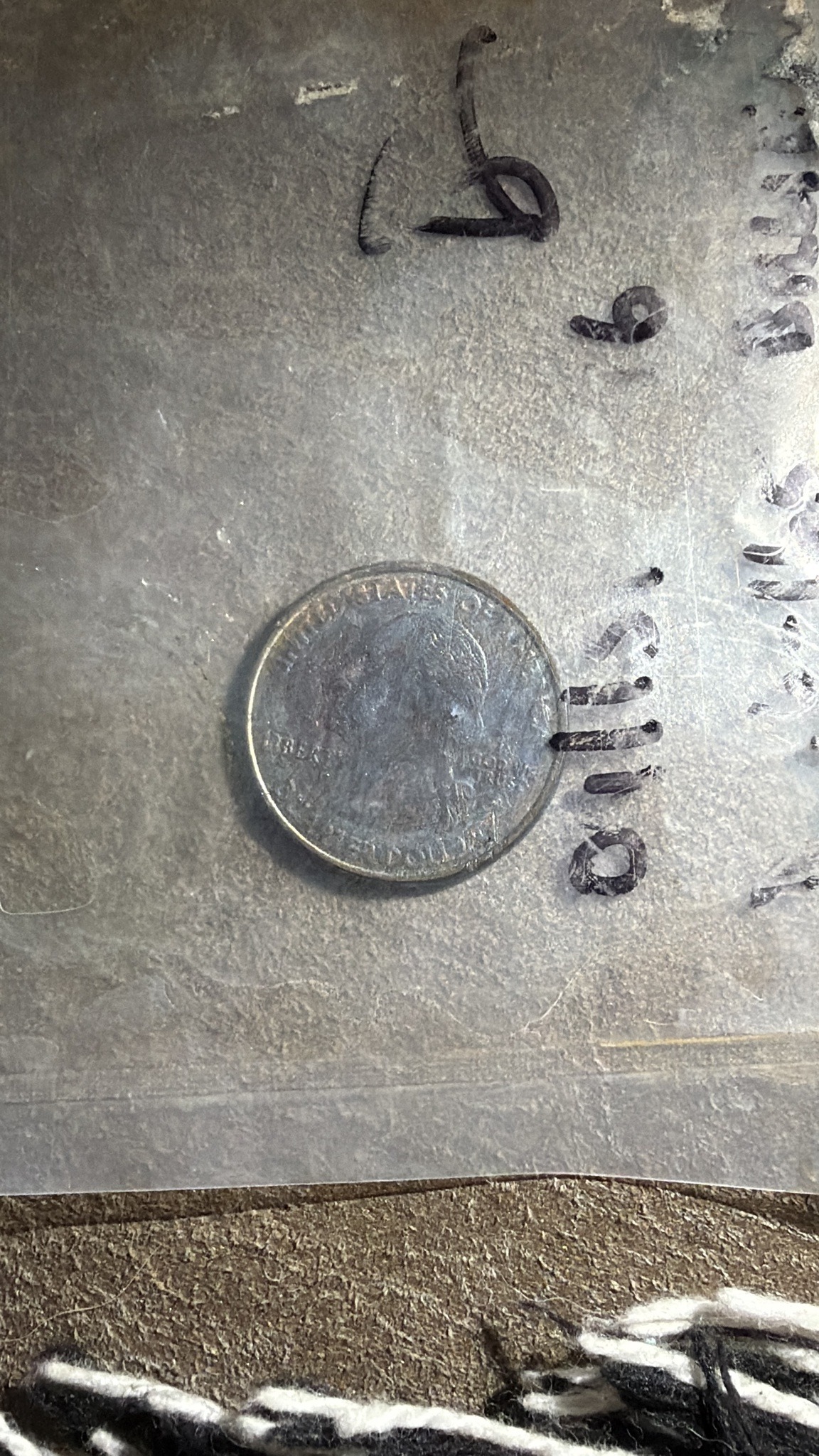 This item is a United States 25-cent coin, commonly known as a Washington Quarter, featuring the left-facing profile of George Washington as originally designed by John Flanagan. The coin is composed of a copper-nickel clad over a pure copper core, which is standard for currency minted since 1965. Visually, the specimen exhibits significant environmental damage or heavy oxidation, resulting in a dark, mottled grey and brownish patina that obscures much of the fine luster and detail. The inscriptions 'LIBERTY', 'IN GOD WE TRUST', and 'QUARTER DOLLAR' are visible though partially muffled by surface corrosion and wear. The coin appears to be in a circulated, lower-grade condition with noticeable rim bruising and surface pitting. It is currently housed inside a clear plastic bag that has various handwritten markings in black ink, which may indicate a temporary collector's label or private inventory system. While the specific mint mark and date are difficult to discern through the heavy toning and plastic film, the design follows the post-1965 standardized US currency production. The degree of surface crusting suggest it may have been exposed to harsh weather or soil for a prolonged period, typical of 'metal detected' finds.