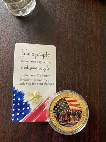 This commemorative set consists of a challenge coin, a lapel pin, and an accompanying message card. The challenge coin is housed in a clear acrylic protective capsule. It features a high-relief design with a gold-tone metallic finish along the outer rim, which is inscribed with 'VETERANS' and 'REMEMBERING ALL WHO SERVED'. The center of the coin displays a full-color graphic depicting five military silhouettes standing before a waving American flag. The lapel pin is a five-pointed star with a polished gold-finish and a faceted, three-dimensional surface. It is mounted on a white cardstock backing that features a motivational quote about service and freedom, accented with an American flag-themed artistic swipe at the bottom. The items appear to be in mint condition, likely produced within the last 10-15 years as contemporary tokens of appreciation for military service members. The craftsmanship is typical of high-quality mass-produced commemorative regalia, utilizing enamel overlays and die-struck metal techniques. No specific maker's marks are visible, though the set follows a standard patriotic aesthetic common in the United States.