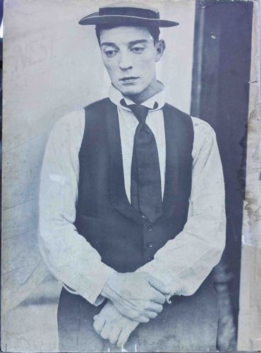 This item is a vintage-style monochromatic portrait of the legendary silent film star Buster Keaton, known for his 'The Great Stone Face' persona. The image captures Keaton in his iconic attire, featuring a flat-crowned pork pie hat, a tall stiff collar with a dark four-in-hand tie, and a dark waistcoat over a light-colored long-sleeve shirt. The subject's expression is characteristically stoic and melancholic. Physically, the print appears to be on a medium-weight paper or cardstock that has significantly aged, showing a yellowish-brown patina across the surface. Notable condition issues include heavy wear to the right-hand edge where the paper is frayed and torn, along with several surface abrasions, creases, and small stains throughout the image. There is faint, illegible writing on the background to the left of Keaton's head (possibly reading 'NEST'). The photography style reflects the early 20th-century Hollywood silent era aesthetic (circa 1920s). The lighting is soft but focuses on the textures of his clothing and facial features. Due to the lack of visible signatures or studio stamps in the scan, it appears to be a mass-produced promotional print or a later reproduction intended to look aged, rather than an original gelatin silver studio proof.