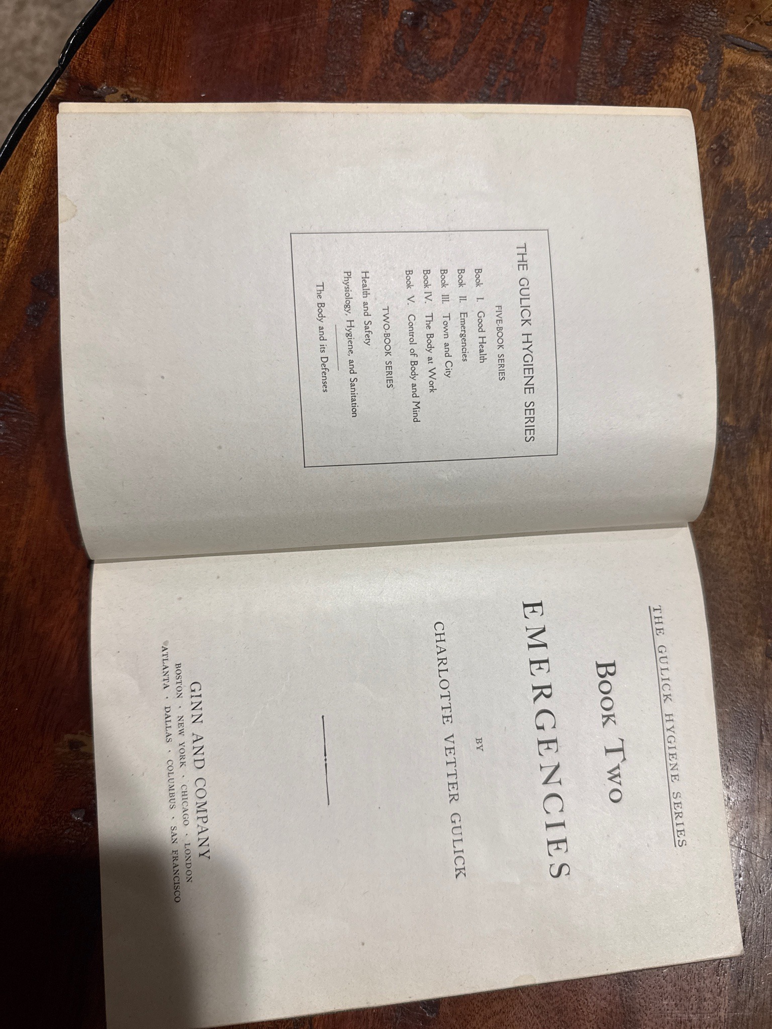 This is an early 20th-century educational textbook titled 'Emergencies,' which is Book Two of the Gulick Hygiene Series, authored by Charlotte Vetter Gulick. The book was published by Ginn and Company, a major educational publisher with offices listed in Boston, New York, Chicago, London, Atlanta, Dallas, Columbus, and San Francisco. The physical construction consists of thick, age-toned paper pages with a matte finish, characteristic of the late Progressive Era (circa 1906-1920). The typography features classic serif fonts popular in academic publishing during this period. The provided image shows the title page and the opposing list of titles in the series, framed within a simple linear border. Notable features include the comprehensive series list, which includes 'Good Health,' 'Town and City,' 'The Body at Work,' and 'Control of Body and Mind.' The condition shows visible signs of age including uniform yellowing and oxidized edges of the paper, minor foxing or light staining on the upper left corner of the left-hand page, and softened corners of the paper. This book was part of a major public health education movement in the United States, intended to teach hygiene and safety to school-aged children.