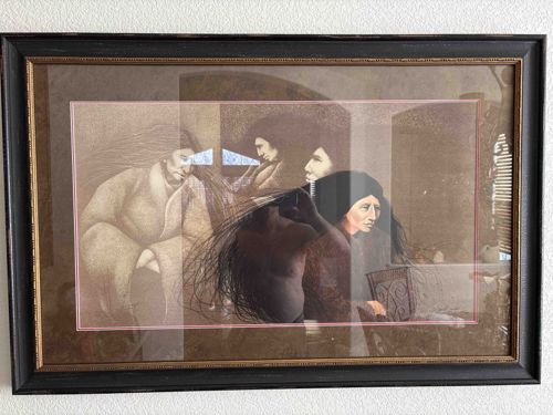 This is a fine art serigraph by the renowned artist Frank Howell (1937-1997), titled and depicting his signature ethereal Indigenous American figures. The composition features several stylized individuals with flowing hair, rendered in a palette of earthy ochres, sienna, and deep browns, accented with delicate line work. The print is traditionally framed with a dark, textured wood molding featuring a gold-toned inner lip and protected by glass. According to provided documentation, this piece is numbered 141 out of a limited edition of 550 and bears the artist's original signature. Howell’s style, bridging the gap between realism and mysticism through layered textures and dreamlike transparency, is clearly evident. The craftsmanship belongs to the Contemporary Southwestern Art movement, likely dating from the 1980s or 1990s. The artwork appears to be in good vintage condition, housed in a professional matting that utilizes a thin red accent border. There is some minor surface wear and light distressing visible on the frame’s edges consistent with age, but the print surface itself shows no immediate signs of foxing, fading, or moisture damage behind the glass. High-quality serigraphy techniques are present in the subtle color gradations and intricate hair details.