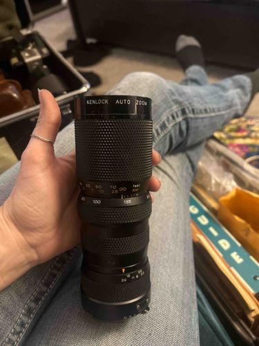 This is a vintage Kenlock-branded manual focus telephoto zoom lens, likely dating from the late 1970s to the 1980s. The lens features a robust all-metal barrel construction with a semi-matte black finish and three distinct rubberized diamond-patterned grip rings for focusing, zooming, and aperture adjustment. The top ring is marked 'KENLOCK AUTO ZOOM' in white uppercase sans-serif lettering. Below the primary zoom ring are distance scales printed in orange for feet and white for meters, extending to infinity. The focal length indicators suggest a versatile range, with visible markings for 100mm and 135mm. An aperture ring at the base displays f-stops ranging from f/4.5 to f/22. Condition appears to be fair used condition, with visible surface dust in the crevices of the textured grips and minor thinning of the black finish on the edges of the metal barrel typical of age and handling. The lens utilizes a mechanical mount, often found in popular mounts of the era like Pentax K, Canon FD, or Nikon AI, though the specific mount is partially obscured. This type of third-party lens was common in the analog era as a more affordable alternative to primary brand optics.