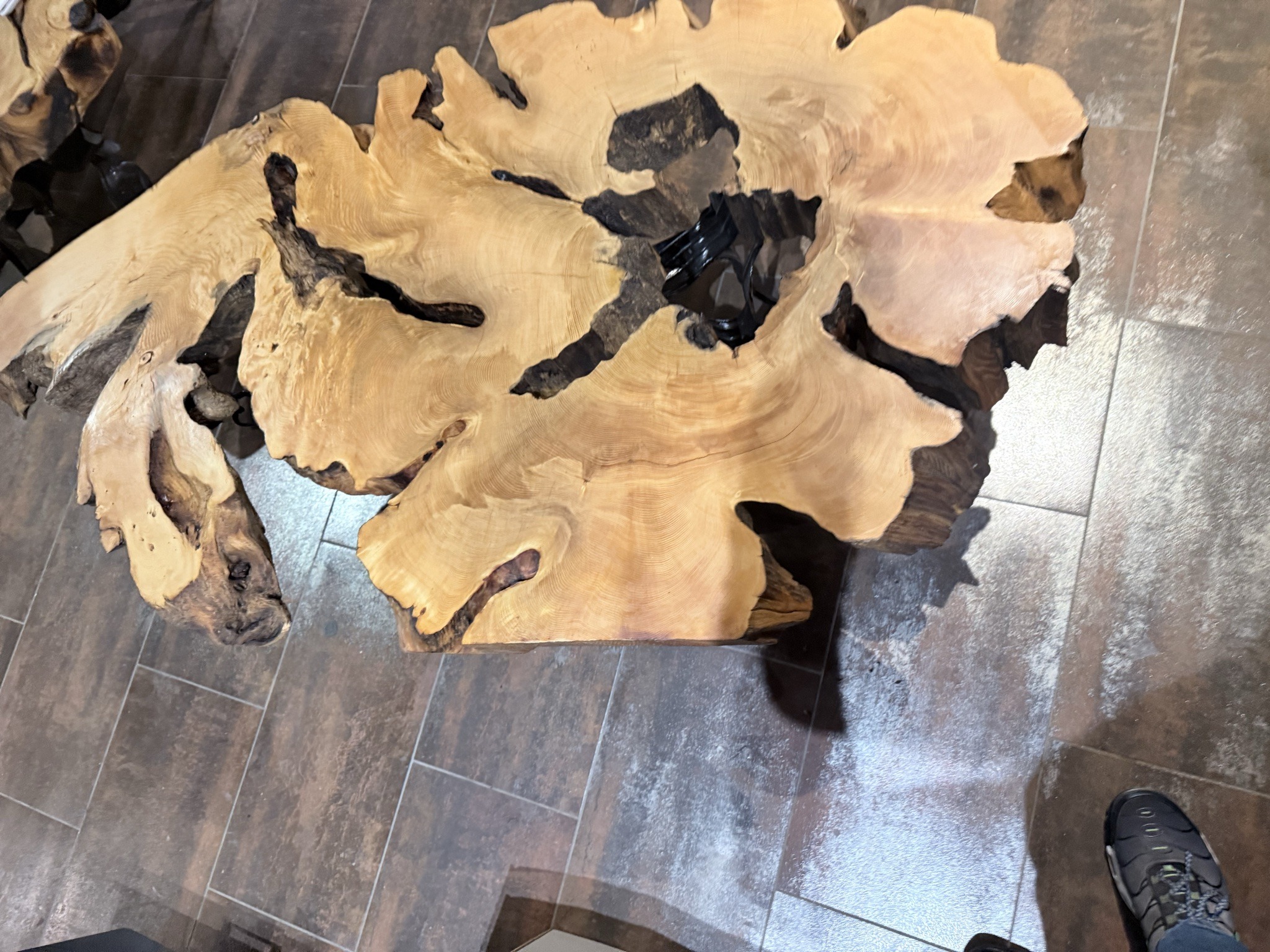 This is a significant live-edge furniture piece crafted from a large cross-section (round/burl) of Tasmanian Huon Pine (Lagarostrobos franklinii), measuring approximately 1200mm x 850mm with a robust thickness of 75mm. The item exhibits the characteristic pale straw-to-golden honey hue of the species, complemented by an exceptionally fine, dense grain structure. It features a dramatic natural silhouette with an irregular, deeply lobed perimeter and several organic inclusions, including a central void that appears to be stabilized or finished to highlight the natural decay and growth patterns. The surface shows a high-quality smooth sanded finish, likely oiled or waxed to preserve the timber's natural luster and aromatic oils. Notable features include dark mineral streaking and 'birds-eye' or 'burl' figure throughout the grain, indicating a very old-growth specimen. The condition appears excellent with no visible structural cracking beyond the natural voids; the edges retain their dark, weathered cambium remnants which provide a stark aesthetic contrast to the light interior wood. As Huon Pine is a protected species and grows extremely slowly, a slab of this dimension suggests a tree age of several centuries, making this a high-value artisan piece of contemporary rustic furniture.
