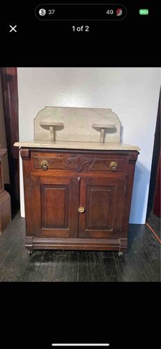 This is a fine example of a mid-to-late 19th-century Victorian washstand, likely dating between 1870 and 1890. The piece is constructed from a dark-stained wood, possibly walnut or mahogany, featuring a distinctive white marble top and a matching marble backsplash. The backsplash is uniquely designed with a shaped top and two small integrated marble candle stands or toiletry shelves. Below the marble surface is a single full-width drawer decorated with a central carved floral or scroll motif and two brass 'teardrop' or ring-pull handles. The lower section consists of a two-door cupboard with recessed panels, providing ample storage. The entire unit sits on a molded base with four small casters, which were a common addition during the era for ease of movement. The craftsmanship is indicative of Eastlake or late Victorian style, characterized by sturdy construction and geometric paneling. Condition-wise, the wood shows a rich, aged patina with minor scuffs and surface wear consistent with age. There is potential staining or light discoloration on the marble surfaces, but no significant cracks or structural failures are immediately visible. The hardware appears original, matching the period's aesthetic and contributing to the overall integrity of the piece.