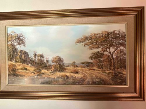 This is a horizontal landscape painting depicting a South African bushveld scene, attributed to the artist W.P. Grobler. The artwork features a dirt road curving through an arid landscape populated by native flora, including prominent acacia-style trees and aloes. A small body of water or reflective puddle is visible in the lower-left foreground, flanked by rocky outcroppings. The palette is dominated by earthy tones of ochre, sienna, and olive green, contrasted against a pale, hazy blue sky with soft cloud formations. The painting is likely rendered in oils or acrylics on board or canvas, demonstrating a realistic aesthetic with careful attention to the texture of the scrubland. The composition is housed in a substantial, multi-tiered gilded frame with a linen-look inner slip or liner, characteristic of mid-to-late 20th-century framing styles. While the painting appears to be in good overall condition with no major visible tears or abrasions, the frame shows some minor age-appropriate wear. The craftsmanship reflects the South African landscape tradition, capturing the soft atmospheric light and rugged topography of the region. This piece represents the late 20th-century regionalist style often sought by collectors of South African art.