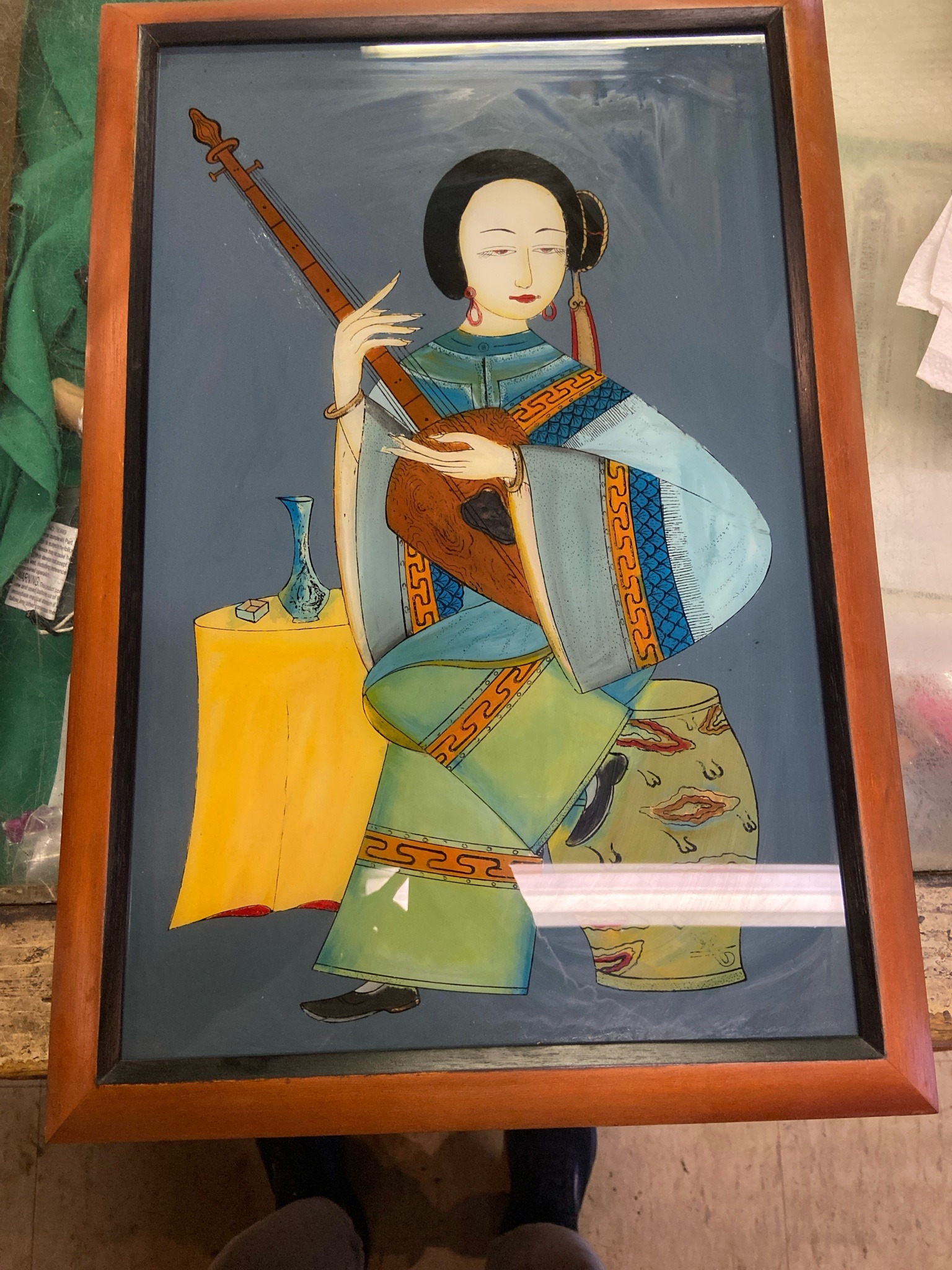 Chinese Reverse Glass Painting of a Lady with a Pipa