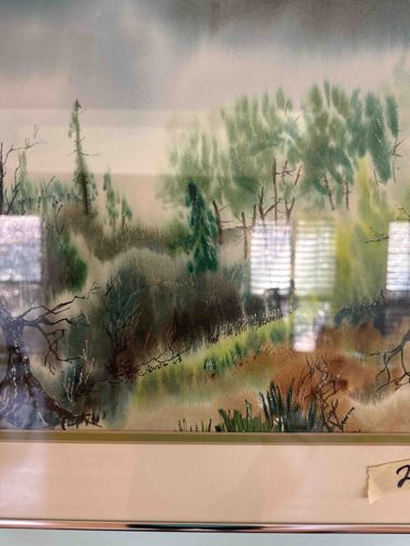 This is an original watercolor painting on paper, executed in an impressionistic or 'wet-on-wet' style. The artwork depicts a dense woodland scene featuring a variety of deciduous and evergreen trees against a moody, overcast sky. The color palette is dominated by earthy greens, deep browns, and muted grays, with hints of ochre and rust in the foreground suggestive of late autumn or early spring. The artist has utilized a combination of soft, washed-out tones for the background foliage and sharper, darker calligraphic lines to define skeletal branches and underbrush. Physically, the piece is presented under glass within a multi-layered matting system, including a cream-colored textured outer mat and a subtle metallic-toned inner fillet. The external frame appears to be a thin, silver-toned metal or polished aluminum typical of mid-to-late 20th-century professional framing (circa 1970s-1990s). Small details such as the vertical reflections of window blinds on the glass indicate it is currently displayed in a residential or office setting. A hand-written label or signature fragment is visible on a piece of light-colored tape affixed to the bottom right of the mat, though the full text is partially obscured. The painting displays good color retention with no obvious signs of foxing or water damage, though it is currently subject to glare that makes fine surface inspection difficult.