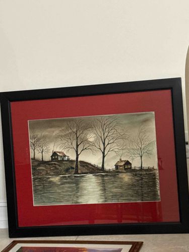 This artwork is a rectangular landscape depicting a serene nocturnal scene, likely executed in charcoal or graphite with possible soft pastel highlights on paper. The composition features two small rustic cabins on a rise overlooking a body of water, with barren, leafless trees silhouetted against a cloudy night sky. A full or partial moon is visible behind the central trees, casting a strong reflection across the water's surface. The color palette is primarily monochromatic, utilizing varying shades of grey, black, and white, with subtle warm tones in the cabin windows and possibly the sky, suggesting a late 20th or early 21st-century contemporary piece. The work is professionally matted with a wide, vibrant red mat that creates a bold contrast against the dark subject matter. The frame is a modern, simple black gallery-style frame, likely made of wood or composite material, housing the art behind glass. The craftsmanship shows a high degree of skill in the handling of light and reflection, particularly in the rippling water and the atmospheric mist around the moon. While no signature is immediately visible in the provided image, the style suggests an artist specialized in atmospheric realism. The item appears to be in excellent condition with no visible foxing, tearing, or discoloration to the paper, and the frame shows no significant nicks or structural damage.