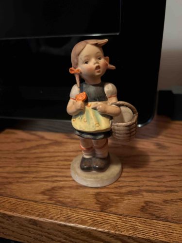 This is a vintage earthenware figurine featuring a young girl, highly characteristic of the M.I. Hummel style produced by the Goebel factory in Germany. The piece stands on a circular, slightly domed base. It depicts a young girl in traditional Germanic attire, including a dark bodice, a yellow apron with blue floral patterns, white puffed sleeves, and white socks with horizontal orange stripes. She holds a small orange flower in one hand and carries a woven basket over her left arm. Her hair is rendered in a light brownish-red tone, styled into two small pigtails tied with bright orange ribbons. The facial expression is sweet and youthful, with large eyes and a rounded face, painted in soft, matted tones typical of Hummel glazes. This style of figurine was famously based on the drawings of Sister Maria Innocentia Hummel and reached peak popularity mid-20th century. The glaze is matte rather than high-gloss, emphasizing the soft pastel color palette of tan, blue, yellow, and orange. Regarding condition, the piece appears to be in very good vintage condition with no visible cracks or large chips from this angle. There is some minor surface dust and potentially light crazing on the base, which is common for ceramics of this age. The craftsmanship is high-quality, with careful hand-painted details on the apron and face. While the specific maker mark on the bottom is not visible, the design and execution strongly indicate a genuine Goebel mid-20th-century production.