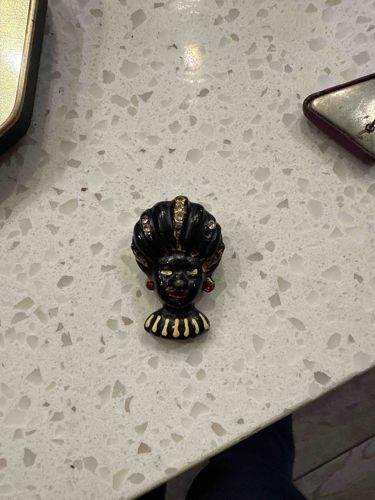This is a vintage costume jewelry brooch featuring a Blackamoor bust motif, a style common in the mid-20th century. The piece is constructed from a die-cast base metal finished with a textured black enamel or lacquer. The figure is depicted wearing an elaborate, ribbed turban or headdress which is accented with vertical rows of clear, faceted rhinestones. The facial features are highlighted with gold-tone or yellow-painted accents around the eyes and a reddish hue on the lips. The figure is also shown wearing orange-toned earrings. At the base, a scalloped collar or necklace is finished in a contrasting cream or off-white enamel pattern. In terms of condition, the brooch shows visible signs of age and wear. There is significant chipping and loss of the black finish on the nose and forehead, revealing the base material underneath. Several of the inset rhinestones are darkened or cloudy, suggesting foil degradation or 'greying,' and there appears to be at least one missing stone on the right side of the headdress. The piece lacks visible designer signatures in this view but stylistically aligns with mass-produced novelty jewelry from the 1940s to 1960s. The overall craftsmanship is mid-tier costume jewelry, characterized by cold enamel application and glued-in stones rather than prong settings.