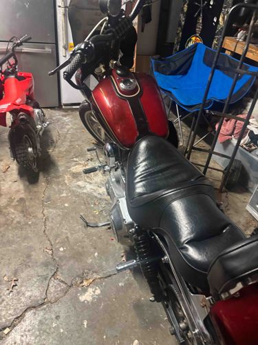 This is a middleweight cruiser motorcycle, specifically a Harley-Davidson Sportster model, likely a 1200 or 883 variant from the late 1990s to early 2000s based on the engine casing and tank design. The bike features a deep metallic red 'peanut' fuel tank with a centered black stripe and gold pinstriping accents. It is equipped with a black leather or vinyl two-up stepped seat that shows moderate creasing from use. The handlebars are fitted with black grips and levers, and a tall circular side mirror is visible on the left. The engine components visible include a chrome air cleaner cover and primary cover, typical of the Evolution V-twin powertrain. Condition-wise, the paint on the tank appears glossy, though the storage environment suggests potential for surface dust or minor scratches. The rear suspension features black coil-over shocks, and the final drive is a belt system. There is some light surface oxidation or dust on the chrome footpegs and lower frame areas. The motorcycle is stored in a garage alongside a small red youth dirt bike, indicating a hobbyist or multi-rider household.