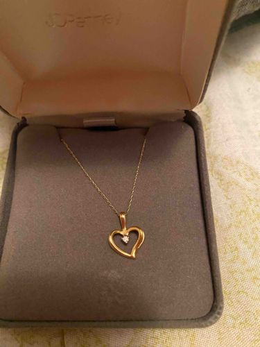 This item is a contemporary open heart-shaped pendant necklace presented in its original JCPenney retail packaging. The pendant features an asymmetrical, fluid open heart design crafted from a polished yellow metal, likely 10k or 14k gold. Nestled within the center of the heart-shaped frame is a single, small round-cut diamond, appearing to be approximately 0.01 to 0.03 carats, held in a classic white metal prong setting to enhance its brilliance. The pendant is suspended from a delicate yellow gold-toned fine link chain (possibly a rope or cable style). The inner lid of the plush velvet display box clearly shows the JCPenney brand logo embossed in gold foil. The overall condition appears excellent to like-new, with the metal maintaining a high-luster finish and no visible scratches, kinking in the chain, or tarnish. This style represents a mass-market fine jewelry piece typical of the late 20th to early 21st century, often sold as a romantic gift. The craftsmanship is consistent with commercial-grade retail jewelry, focusing on popular aesthetic appeal and accessible luxury.