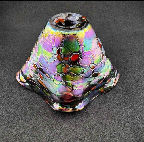 This item is a hand-blown art glass vessel featuring a vibrant iridescent finish and a unique mosaic design. The bowl is structured with a square-bottomed pedestal base that tapers upwards into a ruffled, undulating rim, a hallmark of artisanal glasswork. The exterior displays a complex pattern of cell-like structures in varied shades of violet, emerald green, and deep amber, overlaid with a metallic, pearlescent sheen that creates a 'rainbow' effect when light hits the surface. This effect is likely achieved through an iridescent fuming process involving metallic oxides. The glass appears thick and high-quality, with organic curves and minor asymmetrical variations consistent with handmade production rather than mold-striking. While no maker's marks are visible from this top-down perspective, the style is reminiscent of contemporary studio glass or late 20th-century decorative pieces similar to those produced by Murano artists or American studio glass blowers. The condition appears excellent with no visible chips, cracks, or heavy abrasions; the surface maintains a high luster with no significant signs of oxidation or wear to the iridescent coating. The interior cavity is deep, suggesting it could function as a decorative center-piece, a floral vessel, or a high-end candle holder.