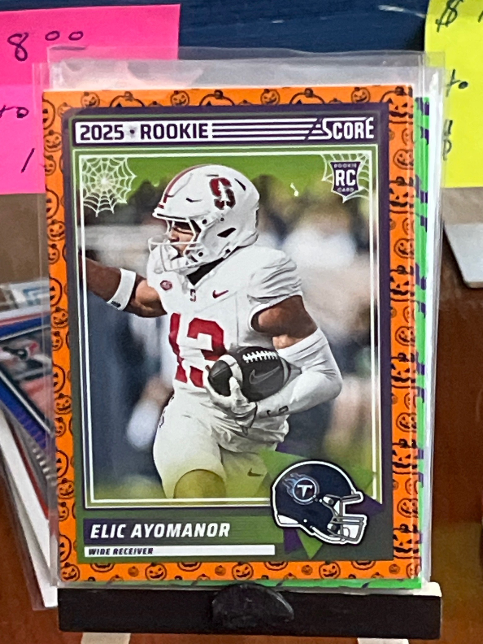 This is a 2025 Panini Score football trading card featuring Stanford Wide Receiver Elic Ayomanor. This specific version is a custom or limited-run 'Jack-o'-Lantern' parallel, characterized by a bright orange border decorated with repeating black pumpkin graphics. The card prominently features the '2025 Rookie' designation and a 'RC' (Rookie Card) logo set within a white spiderweb graphic in the top corners. Ayomanor is depicted in full motion wearing his white Stanford jersey with number 13, holding a Nike football. In the bottom right corner, a Tennessee Titans helmet logo indicates his professional team affiliation or draft projection. The card is printed on standard cardstock and is currently protected within a clear plastic penny sleeve. The condition appears to be near-mint, though accurate grading would require physical inspection for corner sharpness and surface scratching. The manufacturing details include the Score brand logo in the upper right. This set is known for its college-uniformed rookie subsets, and the Halloween motif suggests a seasonal-specific retail release or a themed set variation. The craftsmanship shows clean printing registration and vibrant color saturation, typical of modern high-volume sports card production.