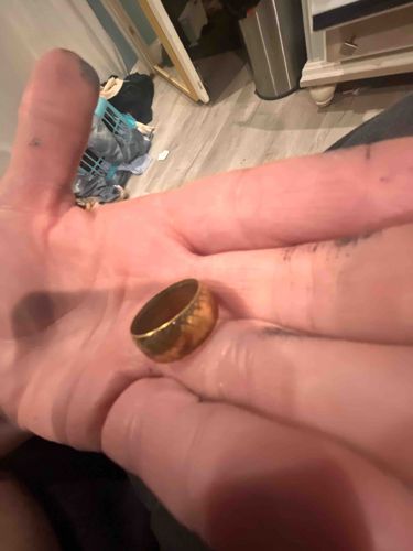 This item is a classic domed-style wedding band jewelry piece, held in the palm of a hand for scale. The ring features a wide profile with a rounded, convex exterior surface (domed) and a flat interior wall. It is high-polish yellow gold in color. The construction appears to be a solid metal band, although without a visible hallmark, it cannot be definitively identified as solid gold versus gold-plated brass or bronze. The width appears to be approximately 6-8mm, which is a common size for men's bands. The exterior shows sign of moderate wear, characterized by numerous small surface scratches and minor scuffs consistent with everyday use. There is a noticeable dark tarnish or patina buildup visible on the inner circumference and along some edges, which may suggest a base metal or a lower karat gold alloy reacting to environmental factors. No specific manufacturer marks, stamps, or signatures are visible in this view. The style is timeless and minimalist, making it difficult to date precisely, though it likely originates from the mid-to-late 20th century or early 21st century. The overall craftsmanship appears standard for a mass-produced jewelry item.