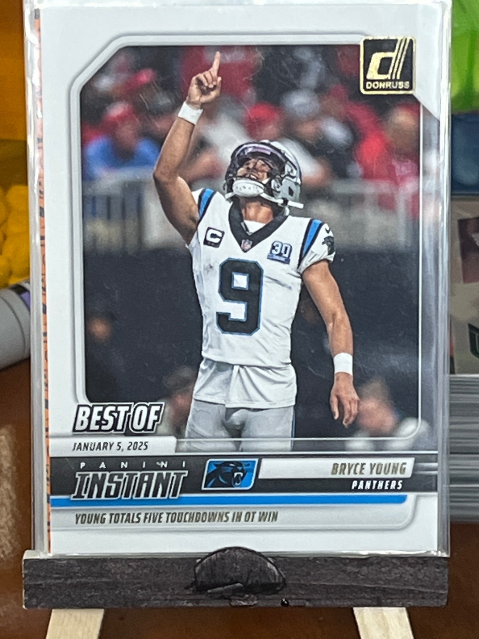 This is a physical sports trading card featuring Bryce Young of the Carolina Panthers. The card is part of the 'Panini Instant' series, which commemorates specific real-time sporting achievements, specifically labeled 'BEST OF' for the date January 5, 2025. The card front depicts Young in a white Panthers away jersey with the number 9, looking upward with one finger raised in celebration. The layout includes the classic Donruss 'Rated Rookie' style 'D' logo in the upper right. Notable text at the bottom reads 'YOUNG TOTALS FIVE TOUCHDOWNS IN OT WIN' alongside the Panini Instant branding and the Carolina Panthers team logo. The card appears to be standard size (2.5 by 3.5 inches) and is constructed from typical layered cardstock with a semi-gloss finish. Based on the visual inspection, the card is housed in a clear protective plastic sleeve and top-loader, resting on a small wooden display stand. The centering appears slightly heavy toward the left border. The surface looks clean with no visible scratches or creases, and the corners appear sharp through the protective casing. This is a modern collectible produced by Panini America, representing the 2024-25 NFL season.