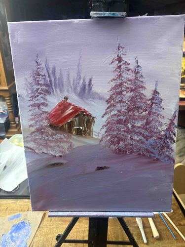 This item is an original landscape painting executed in oil or heavy-bodied acrylic on a vertically oriented stretched canvas, approximately 16x20 inches in size. The composition features a rustic cabin with a prominent red roof nestled within a snowy, mountainous landscape. The color palette is dominated by cool lavender, violet, and monochromatic white tones, contrasted by the warm sienna and bright red of the central structure. The artistic style is heavily influenced by the 'wet-on-wet' technique popularized by Bob Ross, characterized by the use of palette knives to create the sharp, angular textures of the cabin wood and the chimney. The coniferous trees are rendered using dabbing brushstrokes to simulate heavy snow accumulation. The background contains hazy, atmospheric mountain silhouettes, while the foreground consists of broad, horizontal sweeps of paint representing a snow-covered field. There are no visible signatures on the bottom edge or face of the work. The canvas appears to be contemporary and lacks a formal frame, resting on a tabletop easel. Condition appears excellent with no visible craquelure, paint loss, or yellowing of the varnish, suggesting it is a modern piece produced within the last 10-20 years. The craftsmanship displays a hobbyist to intermediate level of skill, focusing on texture and atmospheric perspective over fine detail.