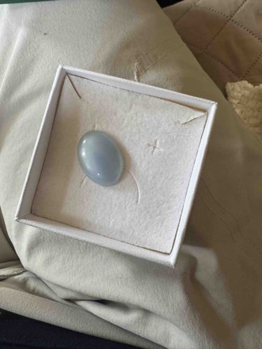 This item is an oval-cut cabochon gemstone featuring a soft, translucent milky blue hue, characteristic of Blue Chalcedony. The stone is shaped with a smooth, domed upper surface and is presented in a simple white cardboard jewelry presentation box with a textured paper lining. The gemstone exhibits a waxy to vitreous luster and appears to have a uniform color distribution with subtle internal clouding, which is typical for this silicate mineral variety. Its size appears moderate, likely measuring approximately 15mm to 20mm in length. The condition of the gemstone is excellent, showing no visible surface scratches, abrasions, or chips along the girdle of the stone. There are no identifiable maker's marks or stamps, as it is a loose gemstone rather than a finished piece of jewelry. The craftsmanship is evidenced by the symmetry of the oval cut and the high polish of the surface. This type of stone is popular in contemporary and bohemian-style jewelry, often associated with a serene aesthetic. Its value would be determined by its exact carat weight, clarity, and the intensity of the blue saturation upon closer gemological inspection.