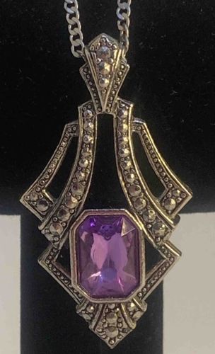 This necklace features a teardrop-shaped Art Deco-inspired pendant characterized by strong geometric lines and symmetry. At its center is a large, emerald-cut violet-purple stone, likely an amethyst-colored paste or synthetic crystal, measuring approximately 12x10mm. The central stone is held in a bezel setting within an ornate openwork frame. This frame is constructed from a silver-toned base metal, possibly sterling silver, featuring numerous small, rose-cut marcasite stones bead-set throughout the structure. These marcasites provide a characteristic metallic, subtle glitter against the dark, oxidized metal background. The pendant exhibits a vertical geometric arrangement with tiered side elements and a decorative articulated bail also set with marcasites. It is suspended from a simple fine-link curb chain. The condition appears fair to good with a notable aged patina and darkening of the metal, particularly in the recessed areas (milgrain detailing). There is visible surface wear and slight dulling on the central stone facets consistent with use. The piece reflects the geometric aesthetics of the 1920s-30s but is likely a vintage reproduction from the mid-to-late 20th century. No clear manufacturer stamps or metal purity hallmarks are visible in the primary view.