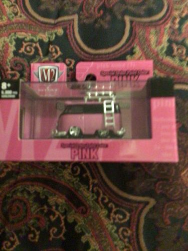 This is a 1:64 scale die-cast metal model of a Volkswagen Microbus Deluxe, manufactured by M2 Machines as part of their 'Special Limited Edition Color PINK' series. The vehicle features a two-tone paint scheme consisting of a high-gloss bubblegum pink lower body and a black upper section. It is equipped with chrome-finished bumpers, a chrome roof rack, and a side-mounted ladder, which are characteristic of customized vintage camper styles. The model is presented in its original retail window-box packaging, which prominently features 'PINK' branding and the M2 Machines logo. The packaging indicates a limited production run, likely restricted to a specific number of units worldwide, which is a common practice for this brand to enhance collectibility. The vehicle itself appears to be in mint condition, secured on its black display plinth inside the clear acrylic-style viewing window. The cardboard outer box shows some minor softening at the corners but remains intact. Notable details include rubber-like tires on chrome rims and accurately scaled windows. This piece likely dates from the 2010s to the present and represents a modern collectible aimed at toy car enthusiasts.