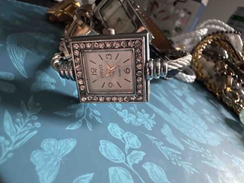 This is a contemporary fashion-style ladies' wristwatch featuring a square-shaped silver-tone metal case. The bezel of the watch is heavily embellished with a single row of pave-set clear rhinestones, adding a decorative spark to the piece. The dial is light-colored, possibly white or silver-white, and features the brand name 'Beya' under the 12 o'clock position and 'QUARTZ' above the 6 o'clock position. The hour markers are a mix of Arabic numerals (12, 3, 6, and 9) and simple stick indices, accented by gold-tone or bronze-toned dauphine hands. The case is integrated into a unique cabled or 'twisted-rope' style bangle bracelet made of polished silver-tone metal, which terminates in decorative ribbed end caps near the lugs. The overall construction suggests a base metal composition typical of mass-market fashion accessories from the late 20th to early 21st century. Notable condition issues include visible surface grime, potential oxidation or tarnishing on the silver-tone finish, and general wear consistent with use. The quality is indicative of a budget-friendly accessory rather than luxury horology, relying on a Japanese or Chinese quartz movement for timekeeping.